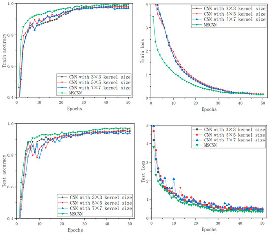 From the results in loss function, the loss function of MCMS-CNN is considerably superior to those of other CNNs on the training and testing sets. After only 30 epochs, the test loss function of MCMS-CNN drops rapidly and remains stable. In comparison, the test loss functions of the three single-scale-based CNNs decline slower, of which the slowest one is the CNN model with a 7 × 7 kernel size. In terms of the final stable state, MCMS-CNN reaches a stable state after 30 epochs, and the CNN model with 7 × 7 kernel size reaches a stable state after 45 epochs. In terms of training loss function curves, the loss function curve declines faster than those of single-scale-based CNN models. The loss functions of the remaining three models decline similarly.
