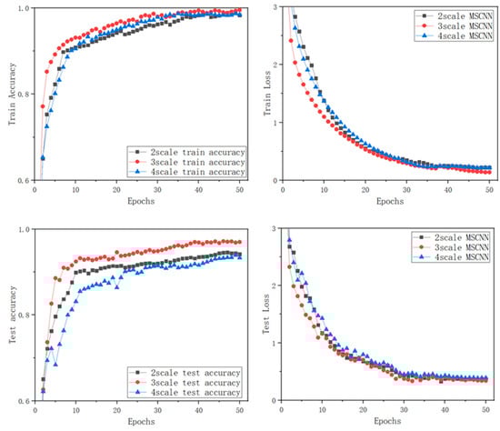 The training accuracy curves demonstrate that MCMS-CNNs of different scales achieve state-of-the-art training accuracy after 50 epochs, and the overall trend is relatively similar. However, the training accuracy of 3channel-3scale CNN is slightly superior to those of the two other MCMSCNNs. From the results in training loss, the loss functions of the three models drop rapidly in the first 20 epochs. Among them, the declining speed of the 3channel-3scale CNN is slightly ahead of those of the two other MCMS-CNNs. The worst performance is shown by the 4channel-4scale CNN. The decline rate is slightly slower than those of the two other MCMS-CNNs. The testing accuracy curve of the proposed method is significantly higher than that of the other two models. From the test loss value comparison, these models gradually become smooth with the increase in iterations. The proposed model converges slightly faster, and reaches a stable convergence state at the 30th epoch.