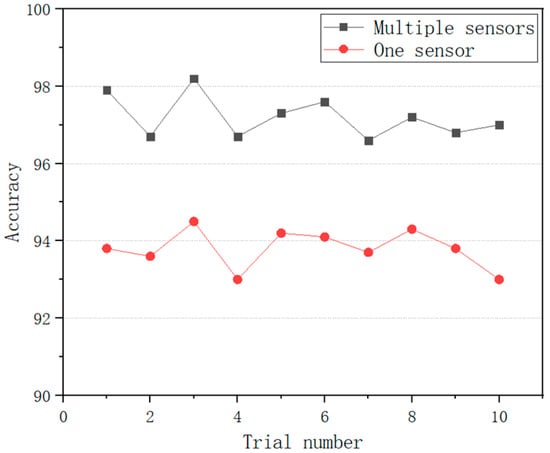 To illustrate the effectiveness of the STRIM method, the signal from only one sensor (DE) is used for comparison. The time-domain signal of one sensor (DE) is transformed into gray images using STIM according to the method of []. Next the gray images are fed to the MCMS-CNN for fault classification. As shown in Figure 12, 10 trials are performed to diagnose the bearing conditions. The average test accuracy is 97.2% via multisensory fusion, which is higher than the average test accuracy of 93.8% using only one sensor. The result illustrates that the RGB images processed by STRIM contain all fault information, and the multi-sensor fusion method provides high-quality feature sources for subsequent feature extraction, and has a better robustness and a higher accuracy.