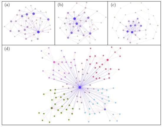 In some complex networks, high-degree nodes predominately connect to other high-degree nodes, such as celebrities in social media preferentially connecting to other celebrities, with these networks being described as assortative mixing. In contrast, in other networks, high-degree nodes tend to connect with low-degree nodes, such as celebrities in social media preferentially connecting only to their fans; the network is said to have a dis-assortative mixture. To capture these trends in degree–degree correlations, the parameter r has been proposed [], defined as the Pearson correlation coefficient of degree between pairs of connected nodes, which can take values within the interval . For , the network shows assortative mixing patterns, while for , it shows dis-assortative mixing trends. For practical purposes, the procedure introduced by Doyle et al. [] was used to generate three different configurations: (i) assortative, (ii) dis-assortative, and (iii) neutral [] (see Figure 1a–c). Briefly, the nodes are sorted from the highest to the lowest degree. Then, to generate case (i), we first consider the node with the highest degree and then add links to the nodes in descending order until we complete the degree of the rest of the nodes. In the opposite way, to generate case (ii), we start from the node with the highest degree and add, first, the links to the nodes of lower degree according to the ascending order. Finally, to generate the case (iii), nodes are randomly linked according to the degree of each node. In all cases considered, repetition of links and disconnectedness of the network will be avoided.