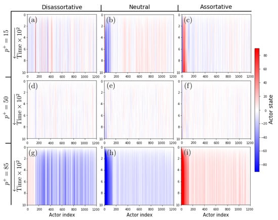 Time evolutions of the states of the actors for different levels of assortative mixing of scale-free networks. We show the cases of (left column) dis-assortative, (center) neutral, and (right column) assortative mixing. Each row represents the case of percentage of positive inputs (top row) , (middle row) , and (bottom row) . We observe that for the case when most of the interactions are competitive, the system evolves towards configurations where the nodes (actors) tend to be stable but opposite states (panels (a–c)), which is mostly noticeable in the dis-assortative case (panel (a)). In contrast, for the case when most of the interactions are cooperative (panels (g–i)), the system evolves to reach greater amplitudes where the states of the actors tend to be markedly similar to each other, and the hubs (which correspond to small indices on the horizontal axis) are the ones that reach the greatest amplitude, except in the dis-assortative case (panel (g)), where the amplitude is lower. For the case with a similar presence of cooperative and competitive inputs, the system is characterized by the formation of unstable clusters for neutral configurations (panel (e)), while in the assortative and dis-assortative cases, these clusters are more stable (panels (d,f)). In all the simulations of this figure, we set .