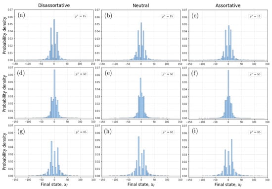 Probability density distributions (PDF) of final states () for different values of and different levels of assortative mixing of scale-free networks. (a–c) Cases of PDFs for a low value . (d–f) Cases of PDFs for an intermediate value . (g–i) Cases of PDFs for a high value . Each PDF represents the results from 20 independent realizations. In all the simulations, we considered scale-free networks with 1200 nodes.