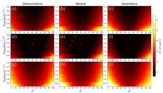 Simulation results for three distance metrics and three SF network configurations. (a–c) Behaviour of the mean global distance (D) for (a) dis-assortative, (b) neutral, and (c) assortative cases; lower values are observed in the three cases for , and these decrease even more as the exponent grows (i.e., when the hubs are reduced in size). It is noteworthy that a greater divergence is observed in the assortative case compared to the opposite case (dis-assortative). (d–f) For the average of absolute values (). (g–i) For distance according to sign (L). Each value represents the average from 20 independent realizations. In all the simulations, we considered scale-free networks with 1200 nodes.