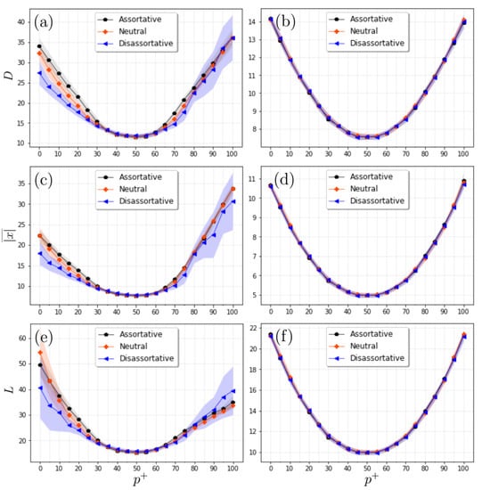 Moreover, we observe that for the assortative and the neutral networks, the separation between the averages (positive and negative), measured by L, reflects an asymmetric behavior with respect to the value (Figure 6e), being larger in the case where all interactions are competitive compared to the case where all interactions are cooperative, because in the latter case, the final states tend to be either all positive or all negative, which leads to a smaller separation. The dis-assortative case tends to be more symmetric, indicating that negative degree correlations lead to a separation of mean values of the same magnitude. When the -exponent is larger (see Figure 6b,d,f), the separation between the curves corresponding to the different pairing trends almost disappears, most likely related to the fact that the reduction in the size of the hubs is responsible for a smaller dispersion of the actors’ states in the whole network.
