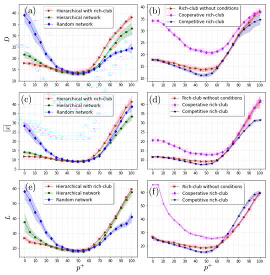 Profiles of D, , and L in terms of the percentage of positive entries for different configurations of hierarchical networks. We observe that the presence of a rich club alters the behaviour of the three metrics (panels (a,c,e)). Panels (b,d,f) show the behaviors of the metrics when the interactions between the hubs forming the rich club are all cooperative or competitive. We observe that cooperation between hubs significantly increases the divergence of the whole system, while competition reduces this separation between the actors. Here, the light-shaded regions surrounding each curve represent the standard deviation determined from 20 independent realizations. In all the simulations, we considered hierarchical scale-free networks with 625 nodes.