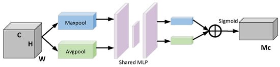 CBAM is a combined spatial and channel attention mechanism network that learns along two independent dimensions of channel and space and obtains the corresponding weights [22]. Supposing that the input feature F is of size , where ,, represent the length, width and number of channels of the feature, respectively. The channel attention is shown in Figure 2. The feature F is changed to after maximum pooling and average pooling, and then inputted to the multilayer perceptron (MLP) with shared weights. After that, by using the sigmoid activation function, the MLP processed and summed features are mapped and the weight coefficients are obtained, which are then multiplied with the input features to get the new features after the channel attention.