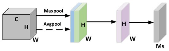 The spatial attention is shown in Figure 3. The features F are spliced on the channel after maximum pooling and average pooling, respectively, obtaining the features, which are inputted to the convolution kernel of size 1 × 7 and the convolution layer with sigmoid activation function to obtain the weight coefficients , which are then multiplied with the input features to obtain the new features after spatial attention.