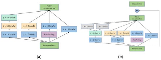 In order to solve the problem of large computational complexity of larger convolutional kernels, this model first uses a 1 × 1 convolutional kernel to reduce the number of channels of the features and then performs the corresponding convolutional operations on them. 1 × 3 pooling can remove the redundant information extracted from the previous layer of convolution, and a larger convolutional kernel of 1 × 7 is set because the correlation of features may vary, and to learn this feature, a large convolutional kernel is required. The number of convolutional kernels in each branch of the module Basic Block A is 16. The improved Inception-Resnet module in this paper can not only overcome the gradient disappearance problem of deep network, but also solve the problem of optimal combination of convolution kernel size. At the same time, splitting the convolution kernel can increase the diversity of features and nonlinear expression. The number of convolutional kernels in the four branches of module Basic Block B are 16, 16, 16, 16, 32, and 32. The structures of modules Basic Block A and Basic Block B are shown in Figure 4.