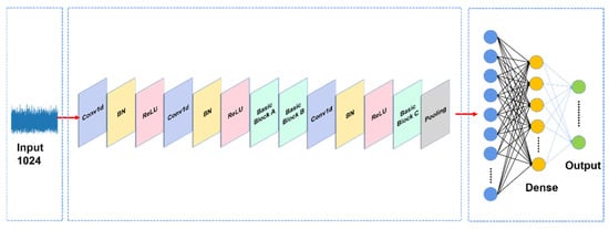 The Figure 6 shows the structure of the MOCNN network proposed in this paper, which consists of two groups of convolutional layers, batch normalization layers and activation layers, among which the number of the first group of convolutional kernels is 32, the second group is 64 and both are of size 1 × 3. The number of convolutional kernels in the convolutional layer behind the Basic Block B module is 128, and its size is also 1 × 3. Basic Block C connects with the GlobalAveragePooling layer, then sets parameters of the Dropout layer to 0.5 to prevent the model from overfitting. In all convolutional layers, the step size is set to 1. Categorical Crossentropy is used as the loss function, Adam is chosen as the optimizer, the initial learning rate is set to 0.001, and the L2 regular term is added to the dense layer of the model to prevent overfitting.