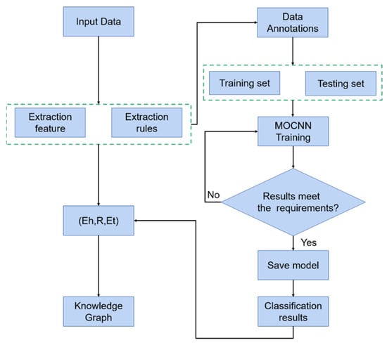 The fault diagnosis scheme proposed in this paper is mainly divided into three parts. The process is shown in Figure 7. First of all, the rules are extracted using the knowledge of equipment mechanism, and the rule nodes are matched with the node attributes to complete the entity extraction, then the rules are used as a classification basis and combined with the equipment operation data for labeling; the MOCNN model is trained through the training set and the test set is used for testing to complete the task of fault classification and to realize relation extraction. Finally, the triplet is constructed according to the entity and relationship, and the construction of the fault knowledge graph is completed through the relationship triplet.
