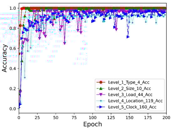As shown in Table 3, DE12 has the largest amount of data (30,000, 1024), while NO has the least amount of data (2000, 1024), which represents a big difference in the amount of data. However, it converges quickly and achieves 100% accuracy, which proves the advantage of the model. Next is the second level fault node classification, and no normal data is added to this level of classification as normal data does not have fault characteristics. As shown in Table 4, there are 10 categories of data. Although the amount of data is unbalanced, the model quickly reached 99% accuracy, with slight fluctuations compared to the level 1 fault classification curve; the third level fault classification curve converges more slowly compared to the second one, the accuracy reaches 97.63%; the accuracy of the fourth level fault classification shows a slight decrease due to a sharp increase in classification categories in the face of unbalanced data volumes. Nevertheless, the accuracy still reaches 93.35%, which is a very impressive result in practical engineering applications; the data volume of the fifth level fault classification is relatively more balanced since each category is (500, 1024), the accuracy reaches 97.86% and the other evaluation indexes are basically the same, achieving a better fault diagnosis result.
