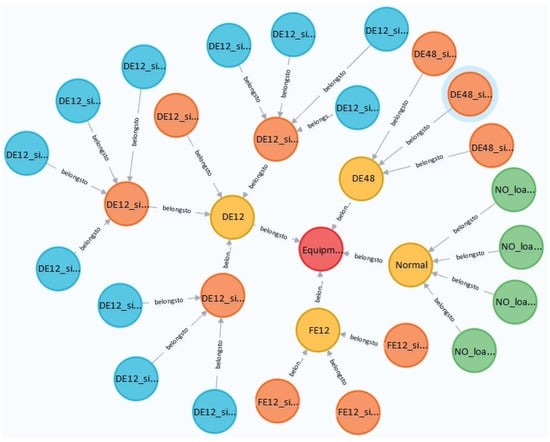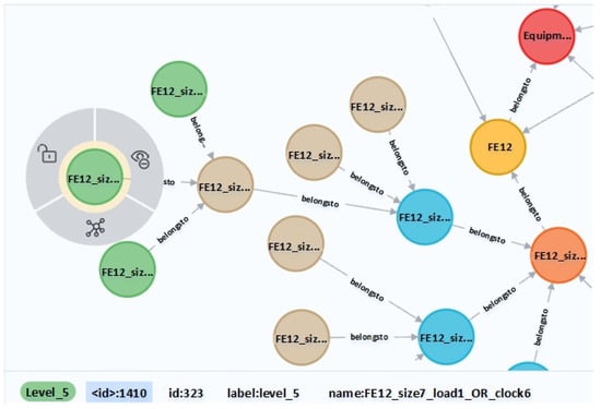 As shown in Figure 10, neo4j can set the number of levels and nodes displayed. The figure shows a total of 30 nodes with a total of four levels. The red point in the center is Level_0: Equipment, the four yellow points are Level_1, which are DE12, DE48, FE12, Normal, the orange is Level_2, and the blue is Level_3 and the connections at each level can be clearly observed. The Figure 11 shows some nodes intercepted when all nodes are displayed. When a node is selected, such as the outermost green node, the information of the node, such as id, label and name, will be displayed on the interface. At the same time, the Cypher language can be used to query the nodes.