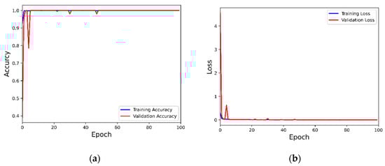 Training accuracy and loss of the MOCNN model for the dataset E: (a) The classification accuracy of MOCNN on dataset E; (b) The loss of MOCNN on dataset E.