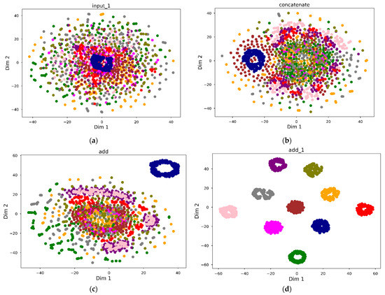 Using T-SNE to visualize the changes in the classification results of MOCNN in different layers (under 3 HP conditions) as shown in Figure 13, the data in Figure 13a passes through the Input layer, and the cluttered distribution of the data can be observed. After passing through Basic Block A and Basic Block B, samples of the same type slowly converge together, and after passing through Basic Block C, a good classification effect has been achieved.