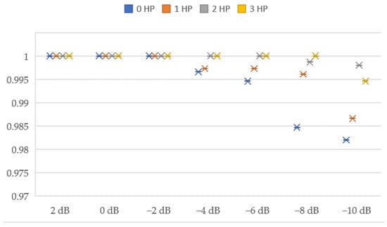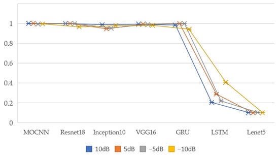 Since the rolling bearing working environment is often accompanied by noise variations, a variable noise working environment is set up to verify that the method proposed in this paper has noise immunity. The definition formula of signal-to-noise ratio is shown in Equation (12). Next, we add different levels of noise to the above datasets A, B, C, and D for testing. It can be seen that the model has achieved 100% accuracy at 2 dB, 0 dB, and −2 dB, indicating that the model has good filtering and anti-noise functions. Meanwhile, the model also achieved 98.2% of the fault diagnosis results under the operating condition of −10 dB. The results are shown in Table 9 and Figure 14.