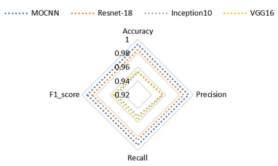 The complexity of the model is an important index to measure the bearing fault diagnosis method. The time complexity determines the testing time of the model, and the space complexity determines the number of parameters of the model. Table 11 summarizes the number of parameters and testing time of each model, from which we can notice that MOCNN has a very light structure, uses a small number of parameters with better performance than Resnet, and has basically the same testing time as the Inception10 network, proving that MOCNN has a high parameter utilization rate, so this model is well suited for application in engineering practices.
