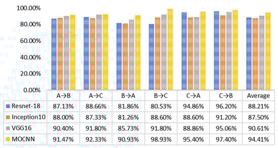 With regard to the analysis of fault diagnosis results under variable load conditions, Datasets A, B and C, were trained at −10 dB signal-to-noise ratio, and then the fault diagnosis capability of the model under different conditions was verified by using test set data under three other load conditions. The results are shown in Figure 17.