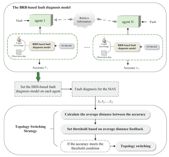In this work, based on BRB, a distributed fault-diagnosis model was constructed for MASs with one or multiple faulty agents. In addition, in view of the problem that the accuracy of the fault-diagnosis model decreases, a corresponding topology-switching strategy was proposed, and the main contributions of this paper are as follows: