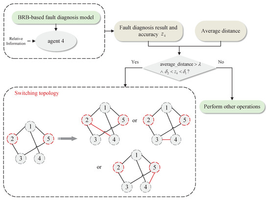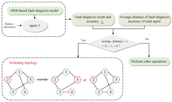 Through the analysis of existing research results, a BRB-based fault-diagnosis model for each agent is constructed by using the relative information between the agent and its neighbors. However, when the relative output information of the agent cannot be accurately obtained or the fault-diagnosis accuracy is too low, this causes the diagnosis results to no longer be reliable. Considering the case when there are multiple faulty agents in a MAS at the same time, when problems like this occur, the relative information used for fault diagnosis may be inaccurate, and the results of the fault diagnosis may be deviated. Therefore, in response to the above problems, this paper proposes a topology-switching strategy. According to the BRB-based fault-diagnosis model, the average distance between the obtained fault-diagnosis accuracy of each agent is calculated, and according to this average distance, the decrease in fault-diagnosis accuracy is divided into two cases, then the threshold is set according to the feedback. When the accuracy of the fault diagnosis meets the threshold condition, the topology structure is updated to improve the accuracy and reliability of the fault-diagnosis method.