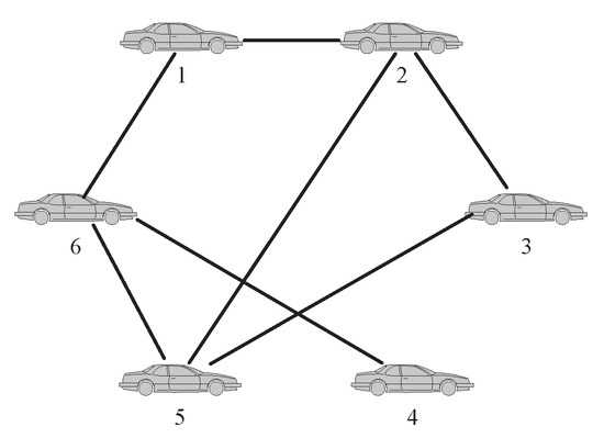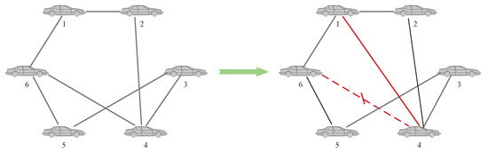 Similarly, for vehicle 5, it can be seen that when vehicle 2 and vehicle 6 fail at the same time, since the neighbor nodes of vehicle 5 are vehicle 2, vehicle 6 and vehicle 3, it may be interfered by the faults of vehicle 2 and vehicle 6, resulting in a decrease in the fault-diagnosis accuracy of the BRB model on vehicle 5, which also satisfies the threshold condition and performs topology adjustment as shown in Figure 13. The adjusted fault-diagnosis accuracy rate also reaches .