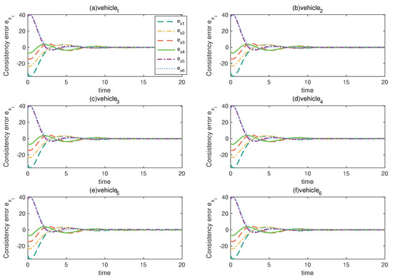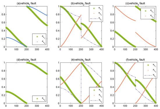 Use the obtained consistent position error as the prior attribute of the BRB model. Figure 9 shows the consistent position error of a vehicle and its neighbors if a vehicle also fails under the premise that both vehicle 2 and vehicle 6 have a constant fault. It can be seen through Figure 9 that the difference in between the vehicle that failed and the other vehicles is not significant; therefore, in order to make the characteristics of the premise attribute more obvious, the obtained consistent position error is normalized. According to the consistent position error, after normalization as shown in Figure 10, set the reference points and reference values for the attributes and output results, and construct the belief rules of BRB, then the BRB-based fault-diagnosis model of this multi-vehicle system can be described as follows: