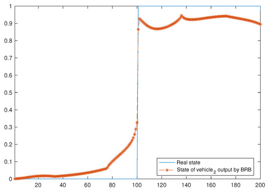 When training the model, the data within [13–15] s are selected for training, and the step size is set to 0.01, so there are 200 sets of data in total. For these 200 sets of data, 100 sets are derived from the data of the vehicle and its neighbors when the vehicle is normal, and the other 100 sets are from the data of the vehicle and its neighbors when the vehicle is faulty. In addition, the number of iterations of the optimized model is set to 50. Figure 11 shows the fault-diagnosis results of the BRB model set on vehicle 2. Similarly, one can obtain the results of the fault-diagnosis model set on other vehicles; Table 6 shows the accuracy of the fault-diagnosis model set on each vehicle.