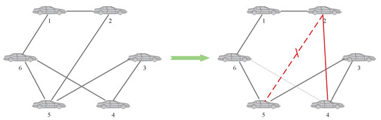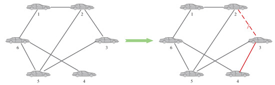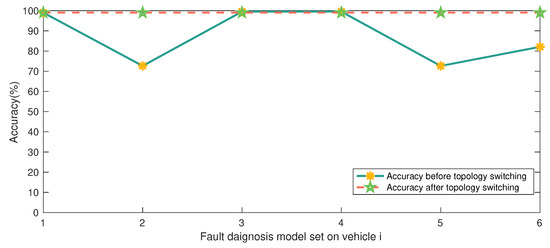 It can be seen from the fault-diagnosis results of each vehicle that when vehicle 2 and vehicle 6 fail at the same time, the model diagnosis accuracy of these two vehicles is low, and the set threshold conditions are met, so the topology structure needs to be adjusted. For vehicle 2, the topology adjustment strategy is shown in Figure 12, and after topology adjustment, the fault-diagnosis accuracy of vehicle 2 reaches .