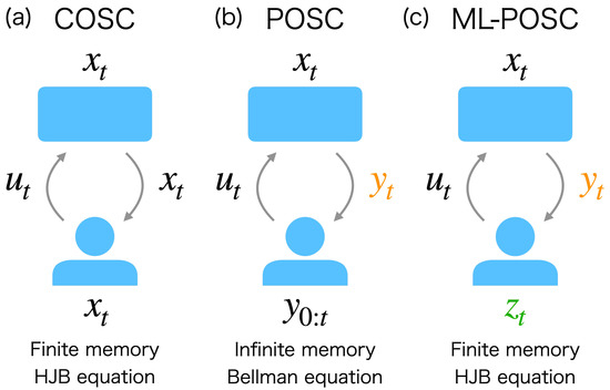 Partially observable stochastic control (POSC) is a conventional theoretical framework that considers the optimal control problem with one of these constraints, namely, the incomplete information of the system state (Figure 1b) [9]. Because the POSC controller cannot completely observe the state of the system, it determines the control based on the noisy observation history of the state. POSC can be solved in principle [10,11,12] by converting it to a completely observable stochastic control (COSC) of the posterior probability of the state, as the posterior probability represents the sufficient statistics of the observation history. The posterior probability and the optimal control are obtained by solving the Zakai equation and the Bellman equation, respectively.