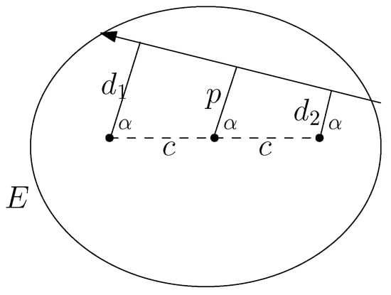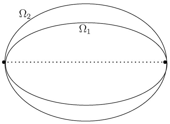Notice first that is the diameter of ellipse. We argue by contradiction. Suppose are two ellipses with the same diameter , satisfying , but , see Figure 8. In this case we can introduce a linear map A which is the expansion map along the y-axes transforming to . Notice that A increases perimeter of any polygon.