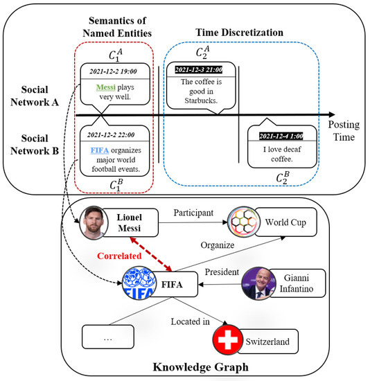 Despite the success achieved by the above methods, there are two main problems in existing content-based methods: first, from the perspective of semantics of texts, existing methods only focus attention on modeling the similarities of words to predict the identity linkage of users, while they fail to explore the similarity of named entities hidden in the texts. Named entities are connected by relations in the knowledge graph, and the named entities introduce external knowledge as additional semantics of the texts. Therefore, the similarities of texts are enhanced through the knowledge graph, and the users with more semantically similar texts are more likely to be classified as the same user. Second, from the perspective of posting time of texts, existing methods discretize the timeline of the texts and model the similarity of texts in each time slice to capture the closeness of posting time. However, after discretization, the texts may fall into different time slices even if their posting time is close, thus the similarity of semantics cannot be measured, which misleads user identity linkage. We illustrate the problems in Figure 2.
