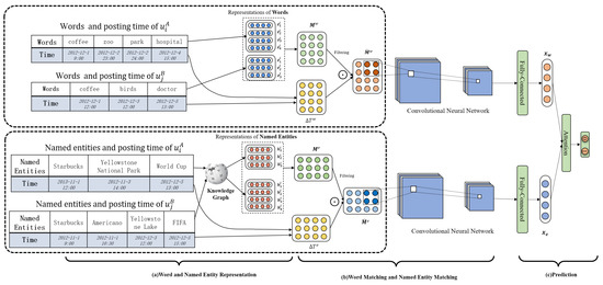 The framework of our proposed method: and are two users from different social networks, and their words and named entities with the posting time are shown in the table on the left. (a) For the words (on the top), the representations of words are initialized, and the similarity matrix based on the pairwise similarities of the words posted by user and are constructed. Next, the time difference matrix based on the posting time is calculated and used for reweighting the word similarity matrix by element-wise production. For the named entity (on the bottom), the named entity is first mapped to the knowledge graph for disambiguation and the representations are initialized for capturing the correlations in knowledge graph. Similarly, named entity matching matrix and time difference matrix are constructed, and the matching matrix is reweighted by the time difference matrix. (b) The convolution neural networks are applied for extracting the word and named entity matching signals. (c) The word and named entity matching signals are aggregated through an attention mechanism for final prediction.