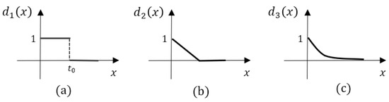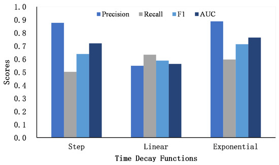 where is an indicator function in Equation (4), and we define that the output is 1 if the x is less than , and 0 otherwise. The time decay functions are monotonically decreasing, and the max value is reached as 1 when the time gap (i.e., the input x) is 0. The step decay function assumes that the word similarities remain consistent until reaching the threshold . Otherwise, the word similarities are discarded. Compared to the step decay function, the value decreases linearly as the time gap grows in the linear decay function. Furthermore, in the exponential decay function, the value decreases rapidly at first, and decreases slowly as the time gap grows. Figure 4 illustrates three time decay functions.