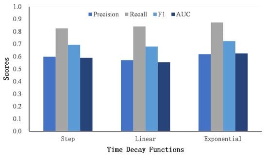 It can be seen that the exponential decay function achieves the best AUC score, followed by step decay, and finally linear decay. Compared with the other two decay functions, the gradient of the exponential decay function is large at first and tends to decrease as the time gap becomes larger. The exponential decay function smoothly captures the similarity of users’ interests over a long period of time, which is suitable for describing the dynamics of users’ posting content. The step function assumes that the similarity of texts exceeding a certain time threshold is 0 to focus the similarity matrix on the scores that are in a close time period. In addition, the linear function assumes that the similarity scores decrease in a linear way. Compared to the exponential decay function, the gradient is invariable as the time gap grows. However, as the time gap becomes larger, the score of the linear function is still higher than that of the exponential function, which may introduce noise to the similarity matrix. In general, we finally adopt the exponential decay function as the weighting function for the word and named entity similarity matrix.