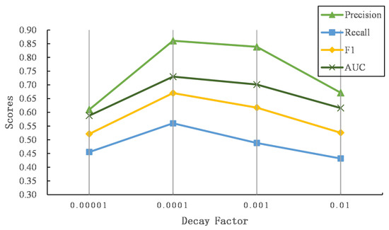 To explore the effectiveness of different in an exponential time decay function (see Equation (6)), we further explore the performance of our proposed model while grows. Figure 9 and Figure 10 show the results of different on two datasets.