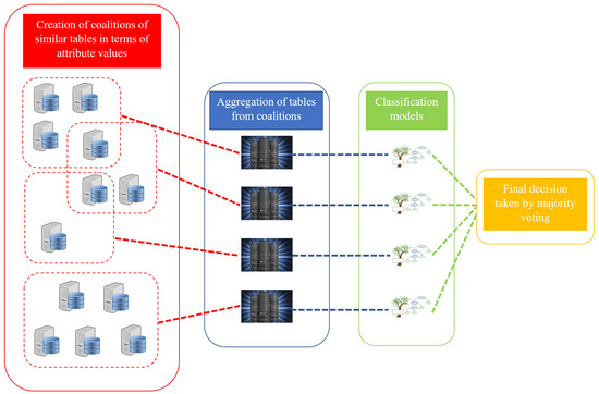 This section describes a new proposed hierarchical system for classification based on dispersed data. In this research, we assume that the sets of attributes appearing in local tables are equal. Stages of system construction are described in the following subsections. The first step involves creating the system’s structure—generating coalitions of local tables. This stage is implemented only once. Our goal here is the cooperation of tables that store similar conditional attribute values. This concept detailing the cooperation of units that share similar views with each other—have compatible values in this case—represents a natural behavior that we can observe in everyday life and nature. For this purpose, characteristics of conditional attributes’ values are calculated. In the next step, coalitions are created based on these characteristics using the Pawlak conflict analysis model. The final step is the aggregation of tables from one coalition. Based on such aggregated coalition’s data, a classifier is built. In this study, we use a decision tree model. The final classification model is a set of such decision trees generated for coalitions. The classification of an object is conducted by the majority voting of these trees. Figure 1 illustrates the workflow of the proposed model.