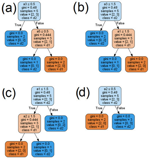 Since local table is left in a coalition containing only one element, the second aggregated table is the same as the local table , therefore, the trees generated based on them are also the same. So we should mainly focus on the tree generated based on the first aggregated table and the three trees generated from local tables , and . As we can see, they are quite different. For example, in the tree generated based on the aggregated table there is a condition the root, which does not correspond to the conditions occurring in the trees in Figure 4a,c,d. In addition, in the aggregated tree, there is the attribute in two internal nodes and the attribute in one internal node. These attributes are not included at all in the trees generated from local tables , and .