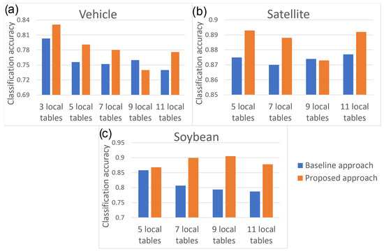 In the case of the baseline method for both the Soybean and the Vehicle data sets, an increase in the degree of data dispersion results in a deterioration of classification accuracy. For the Landsat Satellite data set, this relation is not observed. For the proposed approach, only for the Vehicle set can it be stated that an increase in the degree of dispersion affects the deterioration of classification accuracy. For the Soybean data set, the proposed method eliminates the negative effect of high dispersion on classification accuracy. Thus, it can be concluded that the use of the proposed approach allows improvement in the quality of classification, especially in the case of high dispersion where many local tables occur. In other words, the proposed model generally improves the quality of classification, but is particularly useful for data dispersed over a large number of local tables.