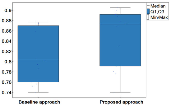 Additionally, a comparative box-plot chart for the accuracy rate values was created (Figure 6). We can observe an increase in accuracy rate when the proposed model is used. Both the box alignment and the median itself are significantly higher when the proposed model is employed.