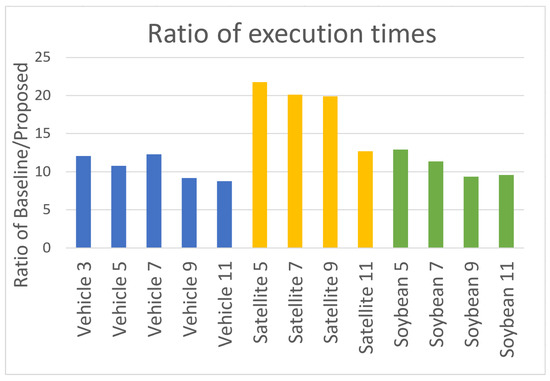 Figure 7 illustrates the ratio of execution times of the baseline approach to the proposed approach. As can be seen for the Satellite data set, in some cases, the proposed approach exhibits an execution time more than 20-fold faster than the baseline approach. In general, it can be seen that for the largest data set (Satellite) the execution acceleration is the most significant.
