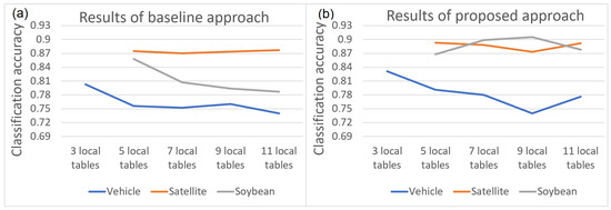 To better visualize the differences in the results generated by the models, Figure 5 was prepared with the classification accuracy marked for each data set. As can be seen, the most significant improvement in classification quality using the proposed approach was observed for the Soybean data set. Here, the improvement is around 0.1. For the Vehicle Silhouettes data set, the improvement in most cases is around 0.03 (even greater in certain scenarios). Furthermore, for the Landsat Satellite data set, the improvement in results was also noticed, but smaller at around 0.015. However, for all data sets, there is a noticeable and seemingly significant improvement obtained using the proposed approach compared to the baseline approach.