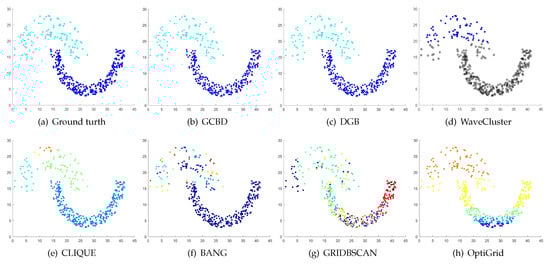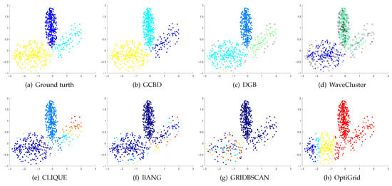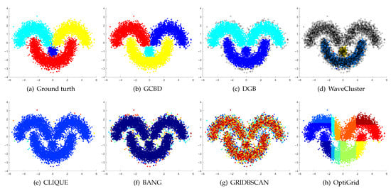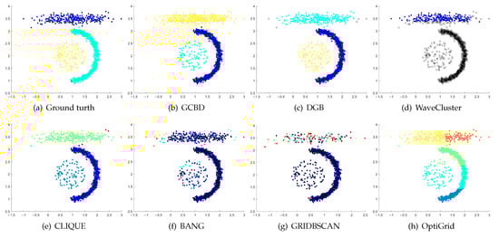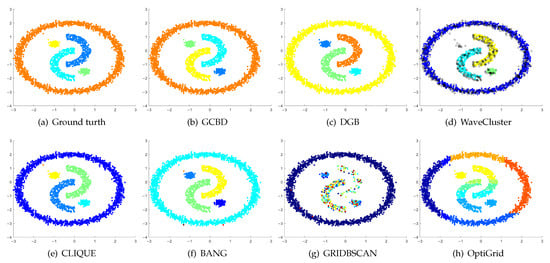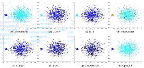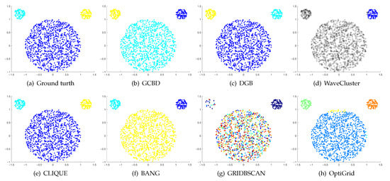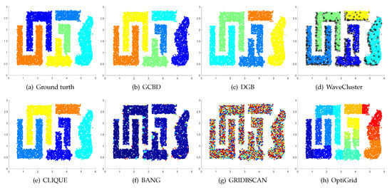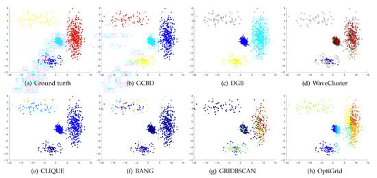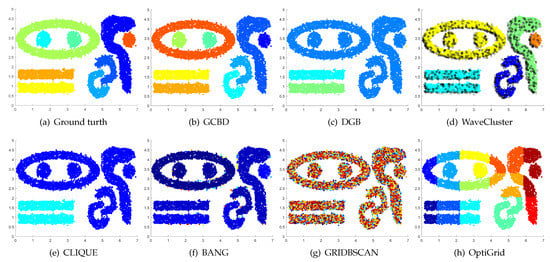 We compare the performance of GCBD with 6 grid-based clustering algorithms, including DGB [27], WaveCluster [24], CLIQUE [25], BANG [22], GRIDBSCAN [28] and OpiGrid [26]. According to the following parameter settings, we search for the best clustering result. GCBD, DGB, WaveCluster, CLIQUE, and OpiGrid all require a parameter l describing the number of intervals. Its range is between . In GCBD, the parameter T indicates the number of iterations. This parameter value lies in the range . DGB and WaveCluster have one parameter . We set ranging from 0.01 to 0.1 with step 0.01. In WaveCluster and BANG, the parameter h indicates the number of levels. Its value falls between . CLIQUE, BANG, and GRIDBSCAN all require a parameter c which indicates the density threshold. Its range is between . GRIDBSCAN has one parameter p. We set p ranging from 0.01 to 0.1 with step 0.01.