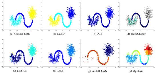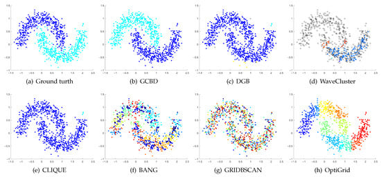 Clustering results on Moons. (a) True structure of the Moons dataset: It consists of two crescent-shaped clusters with different densities. (b) Result of GCBD: It can correctly find the general shapes of each cluster. (c) Result of DGB: Two clusters are mistakenly merged into one. (d) Result of WaveCluster: Points in the cluster upper are wrongly marked as outliers. (e) Result of CLIQUE: Two clusters are mistakenly merged into one. (f) Result of BANG: It yields over-partitioning. (g) Result of GRIDBSCAN: It yields over-partitioning. (h) Result of OptiGrid: Two clusters are divided incorrectly into several small sub-clusters.