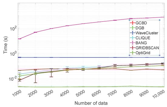 This subsection compares the running times of GCBD and 6 competitors (DGB, WaveCluster, CLIQUE, BANG, GRIDBSCAN, and OptiGrid) on synthetic data sets with different sizes (n = 1000:1000:10,000). For a fair comparison, the number of intervals (a parameter common to GCBD, DGB, WaveCluster, CLIQUE, and OpiGrid) is kept at 20. To determine the running time, we use the average and standard deviation of 50 repeated experiments. We perform all experiments in the Matlab environment on a PC machine containing an Intel(R) Core(TM)-i7-9700F CPU and 32 GB RAM.