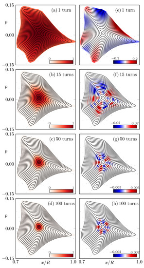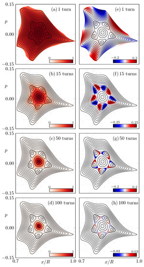 In the following, we analyze the difference between CW and CCW propagation. Therefore, initial conditions on a uniform grid in phase space with unit intensity are iterated turns in CW and in CCW direction. The remaining fractions of the intensity in CCW direction are shown in Figure 2a–d for , respectively. As can be seen, the loss introduced by partial back-reflections from Fresnel formulas is not uniform in the regular region, while the central fixed point suffers almost no loss due to Brewster-angle transmissions, the border of the regular region has more loss, which results in a loss gradient over the resonance chain. A consequence is a distortion of the intensity pattern, which can be seen in Figure 2b,c. This distortion is different for both propagation directions, resulting in a remarkable difference around the resonance chain; see Figure 2e–h. Note that the effect becomes considerably weaker for long times where the only remaining intensity is centered around the central fixed point.