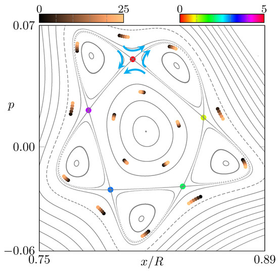 Magnification of the phase-space portrait from Figure 1c around the 5:1 resonance chain. Iterations for selected (nonperiodic) orbits are shown as dots colored from black to orange. The unstable period-5 orbit is represented by dots with a cyclic colormap. The arrows illustrate the dynamics around one of the unstable fixed points. The deformation parameters of the microstar are .