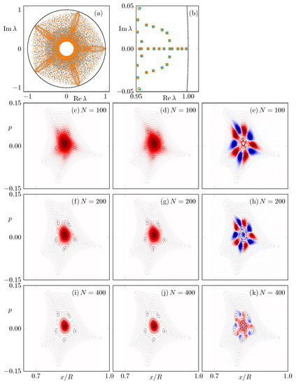 The Frobenius–Perron operator (FPO) describes the evolution of density (intensity) distributions in phase space [36]. It has been used for, e.g., maps [37,38,39,40,41], billiard systems [37], and the asymmetric backscattering in deformed microcavities [42]. Here, the aim is to construct classical intensity eigenstates for CCW and CW propagation in the deformed microstar via the FPO. For this purpose, Ulam’s method [43] is used to construct a matrix approximation of the FPO as follows. The part of the phase space between and covering the regular island is divided into a lattice of uniform rectangular cells. In the cell i, random initial conditions with total intensity are iterated once in (C)CW direction. The transferred intensity to the phase-space cell f is then recorded. Thus, the two matrices with the elements are an approximation for the intensity transport in CW and CCW direction, respectively. As such, the eigenvalues are inside the unit circle, as shown in Figure 5a,b. Of special interest are the eigenstates of the FPO with the eigenvalue of largest magnitude, as they represent states with a long lifetime. For the system with a resonance chain, these long-lived eigenstates for (C)CW propagation are shown in Figure 5c–k, in addition to their differences. As it can be seen, the localization of the eigenstates around the central fixed point depends on the fineness of the discretization given by N. This is consistent with the previous literature on FPO eigenstates of maps with a mixed phase space [39,44]. For an infinite discretization, the intensity is localized on the stable periodic orbit, which is a single point in phase space. However, for a more rough discretization, i.e., , the eigenstates extend over the resonance chain leading to a local intensity distortion, which is different for CW and CCW eigenstates. Consequently, the difference between CW and CCW eigenstates is significant around the resonance chain and consistent with the ray dynamics shown in Figure 2f,g. In particular, the pattern with alternating preference of CW or CCW propagation along the stable and unstable points of the resonance chain is visible.