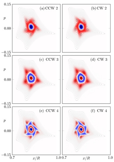 Intuitively, the difference between both propagation directions can be understood by analyzing the dynamics around the resonance chain, as shown in Figure 3. Focusing on one unstable orbit of the resonance chain (see red dot in Figure 3), the dynamics on the left side push the orbits closer to the center of the regular region, whereas on the right side, the orbits are pushed away from the regular region’s center. Hence, orbits on the left side of the unstable orbit will suffer less loss then orbits on the right side in the next iterations. This behavior is inverted when the dynamics are reversed from CCW to CW, which leads to the characteristic pattern of the intensity difference in Figure 2f–h.