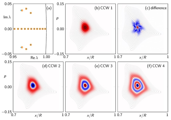 (a) Eigenvalues close to unity of the FPO () for the system without a resonance chain characterized by (cf. Figure 4). (b) Eigenstate of the FPO for the CCW dynamics with largest-modulus eigenvalue. (c) Difference between CCW and CW eigenstate. (d–f) Next eigenstates of the FPO in CCW direction with eigenvalues close to unity.