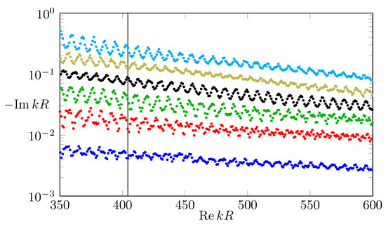 where is the complex frequency which determines the Q-factor (lifetime) of a mode via . To utilize Brewster’s angle, here, transverse electrical polarization is chosen such that the wave function represents the magnetic field as . Hence, along the cavities interface , and its scaled normal derivative are continuous. In addition, is required to fulfill Sommerfeld’s outgoing wave condition. For the numerical calculation of the long-lived modes in the microstar, the boundary element method [46] and FEM software COMSOL [47] are used. In Figure 8, the long-lived modes in the complex frequency plane in the semiclassical regime with are shown. As in the wave regime discussed in ref. [31], the most long-lived mode localizes along the stable periodic orbit passing through the spikes of the microstar; see Figure 9d. However, additional long-lived modes exist in the semiclassical regime that also pass through the spikes but have more intensity maxima in radial direction; see Figure 9a–c. Thus, a classification of these modes with a radial mode number l is suitable.