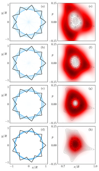 In Figure 9e–h, the Husimi functions of the corresponding modes are shown in the right panel. As an expected result, the Husimi function of the most long-lived mode localizes in the center of the regular island, see Figure 9h, with a maximum at the finite momentum , which nicely reflects the stable periodic orbit. Furthermore, as an expected result, the modes with higher radial mode numbers l have their Husimi functions localized on outer tori of the regular island. Hence, these states can be seen as higher-order quantized states on the regular region. However, in this regime of , the modes cannot localize on the smaller sub-islands of the resonance chain itself. Consequently, the Husimi functions of the related modes interpolate through the resonance chain.
